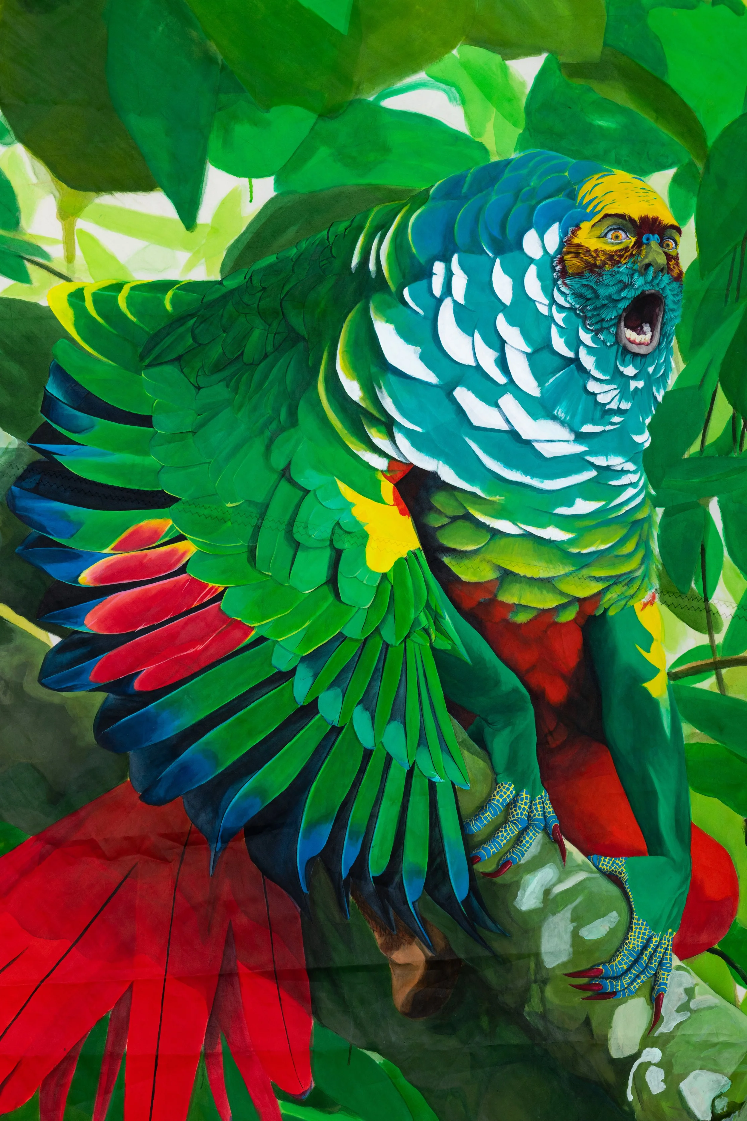 The artist was initially inspired by the Macaw, the quintessential parrot that is native to South America. Beginning to think about parrots “their attributes of camouflage and the ability to mimic vocal pitch” led him to see these birds as a metaphor for assimilation and living between cultures. Adopted at birth from his homeland of Colombia, Yaron spent his early life living on three different continents – Australia, Europe, and North America. As the artist states, “I have always lived between cultures, trying to assimilate, and in this regard, I’ve come to identify with parrots (including the wild, transplant parrots that, like me, call East L.A. home).”